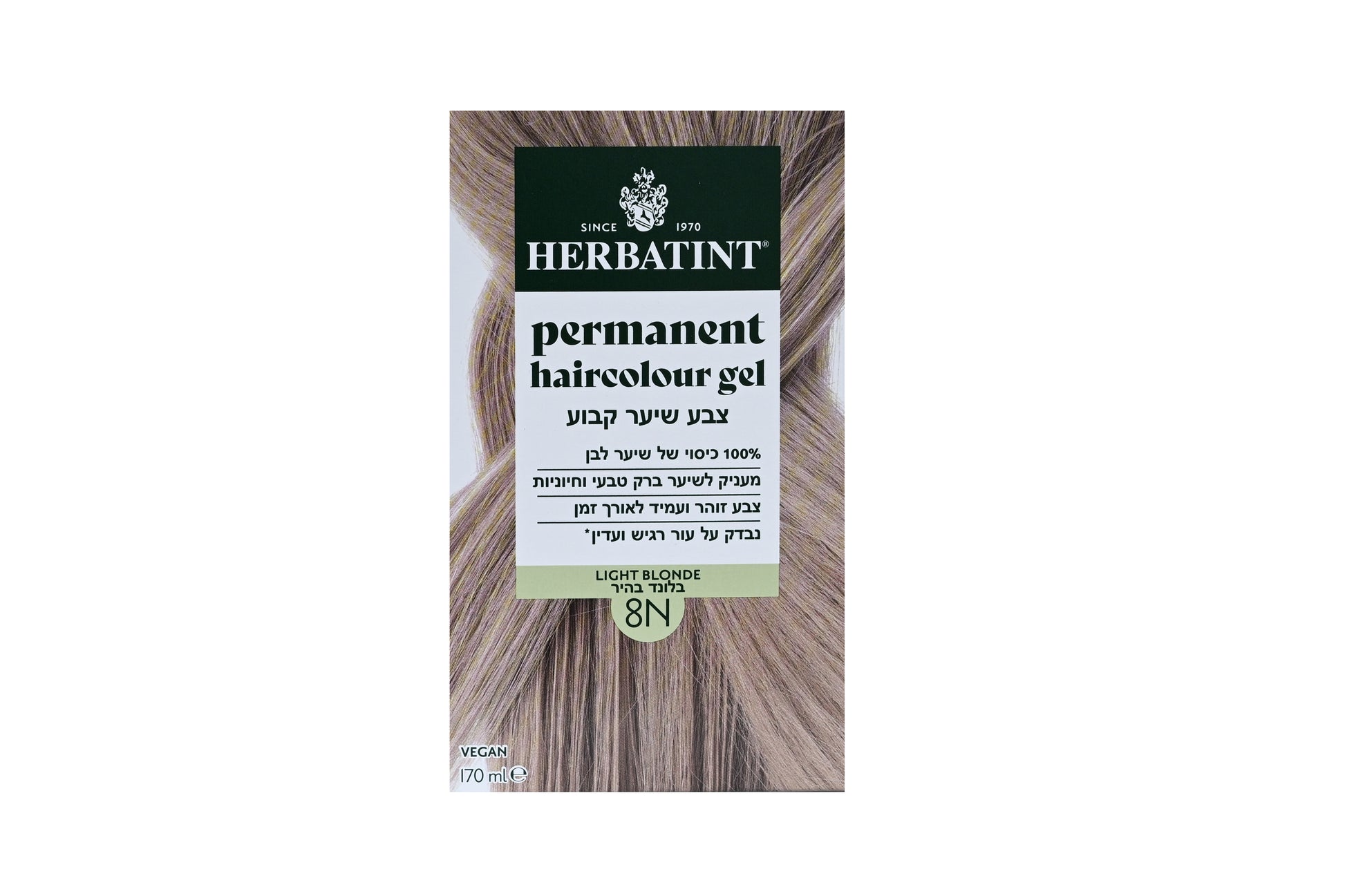 צבע שיער צמחי הרבטינט- צבע שיער קבוע במרקם ג'ל לכיסוי שיער לבן על בסיס צמחים. נטול אמוניה, רסורסינול, ללא גלוטן, בישום, סיליקונים, ניקל, פראבנים, שמן מינרלי וללא אלכוהול. נבדק דרמטולוגית ומתאים לעור רגיש.