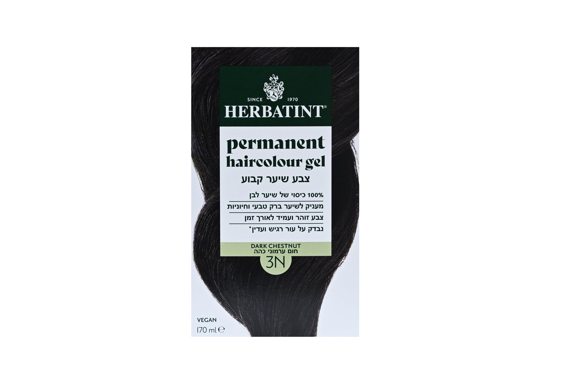 צבע שיער צמחי הרבטינט- צבע שיער קבוע במרקם ג'ל לכיסוי שיער לבן על בסיס צמחים. נטול אמוניה, רסורסינול, ללא גלוטן, בישום, סיליקונים, ניקל, פראבנים, שמן מינרלי וללא אלכוהול. נבדק דרמטולוגית ומתאים לעור רגיש.